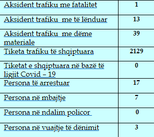 Gjatë periudhës së njëjtë kohore kanë ndodhur 53 aksidente, prej tyre një aksident është me fatalitet, 13 aksidente me të lënduar dhe 39 me dëme materiale.