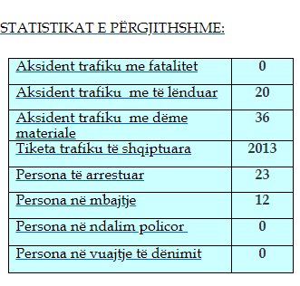 Sipas raportit, në këtë periudhë nuk është shënuar asnjë aksident trafiku me fatalitet, ndërsa janë regjistruar 20 aksidente me të lënduar dhe 36 të tjera me dëme materiale.