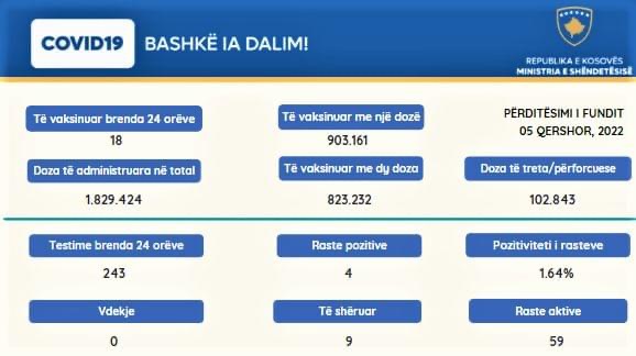 Ndërkohë, në 24 orët e fundit nuk pati viktima dhe u regjistruan 4 raste pozitive, njoftoi MSh.