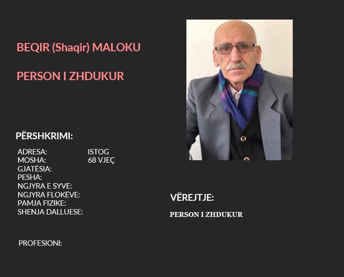 “Policia e Kosovës kërkon nga qytetarët e Republikës së Kosovës që kushdo që ka informacion për vendndodhjen e personit të zhdukur në foton e bashkangjitur, të lajmërojë Policinë e Kosovës apo të lajmërohet në stacionin më të afërt policor. Numrat e telefonit dhe adresat elektronike kontaktuese për të kontaktuar Policinë e Kosovës: