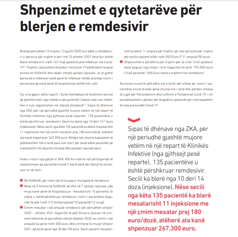 Sipas një hulumtimi të Institutit Demokratik të Kosovës, për një periudhë gjashtë mujore vetëm në një repart të Klinikës Infektive , 135 pacientëve u është përshkruar remdesivir.
