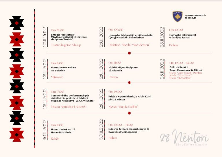 Ministria e Kulturës, Rinisë dhe Sportit e ka publikuar agjendën shtetërore për 28 nëntor, 110 vjetorit të Ditës së Flamurit Kombëtar.
