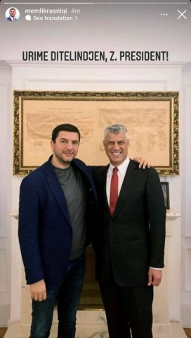 “Gëzuar ditëlindjen z.President”, ka shkruar Krasniqi në një postim në Facebook të cilit ia ka bashkangjitur edhe një fotografi me Thaçin./arbresh.info/