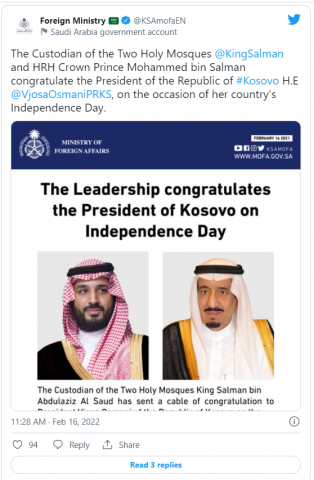 Mbreti i Arabisë Saudite, Salman bin Abdulaziz dhe Princi i Kurorës Mohammed bin Salman, kanë uruar Republikën e Kosovës për Ditën e Pavarësisë me një telegram urimi drejtuar presidentes Vjosa Osmani.
