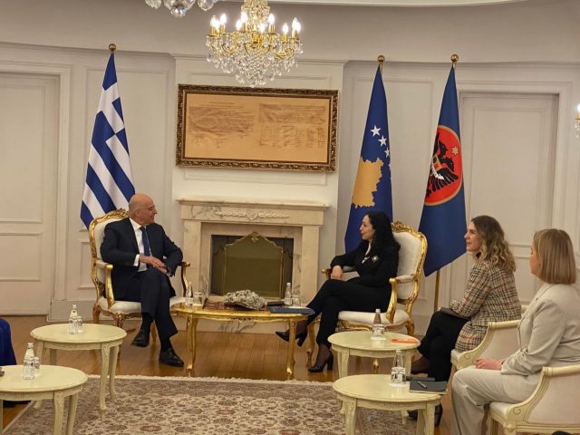 Presidentja e Kosovës, Vjosa Osmani, të dielën ka pritur në takim ministrin e Jashtëm grek, Nikos Dendias.