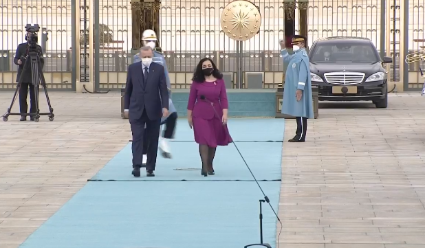Presidentja e Kosovës, Vjosa Osmani është pritur me ceremoni shtetërore nga homologu i saj turk, Rexhep Tayyip Erdogan.