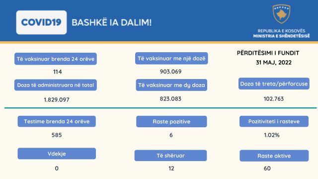31 Maj 2022: Ministria e Shëndetësisë, sipas të dhënave nga Instituti Kombëtar i Shëndetësisë Publike të Kosovës, informon: