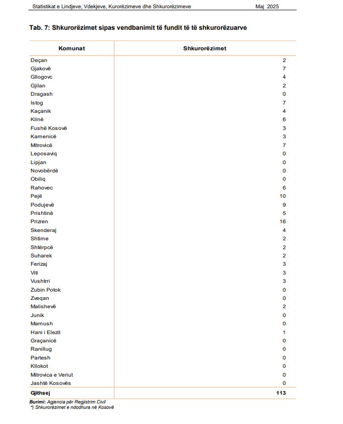 “Sa i përket shkurorëzimeve të ndodhura në Kosovë për muajin Maj janë 113 raste, krahasuar me muajin Prill kemi rënie të numrit të çifteve të shkurorëzuarve për (-19 %)”, thuhet në raportin e ASK-së.