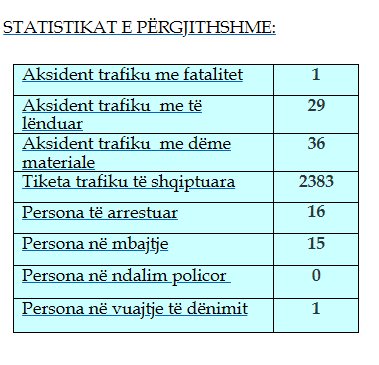 Sipas raportit, në këtë periudhë është shënuar një aksident trafiku me fatalitet, ndërsa janë regjistruar 29 aksidente me të lënduar dhe 36 të tjera me dëme materiale.