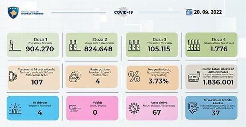 Ministria e Shëndetësisë ka njoftuar se janë katër raste pozitive me Covid-19 nga 107 teste të bëra.