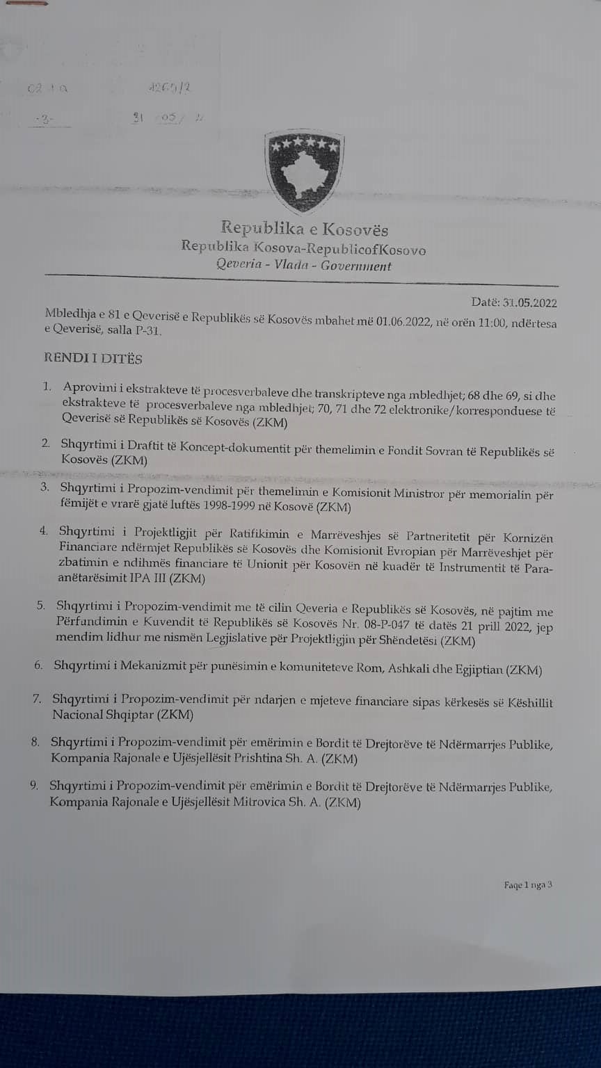 Në mbledhjen e sotme të kabinetit qeveritar ndër pikat e rendit të ditës do të jetë edhe shqyrtimi i draft-konceptit për themelimin e Fondit Sovran të Republikës së Kosovës.