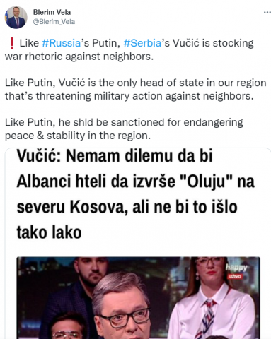 “Njësoj sikurse Putini, Vuçiq është i vetmi president shteti në rajonin tonë që kërcënon me veprime ushtarake kundër shteteve fqinje. Sikurse Putini, ai duhet të sanksionohet për rrezikimin e paqes dhe stabilitetit në rajon”, ka shkruar shefi i kabinetit të presidentes.