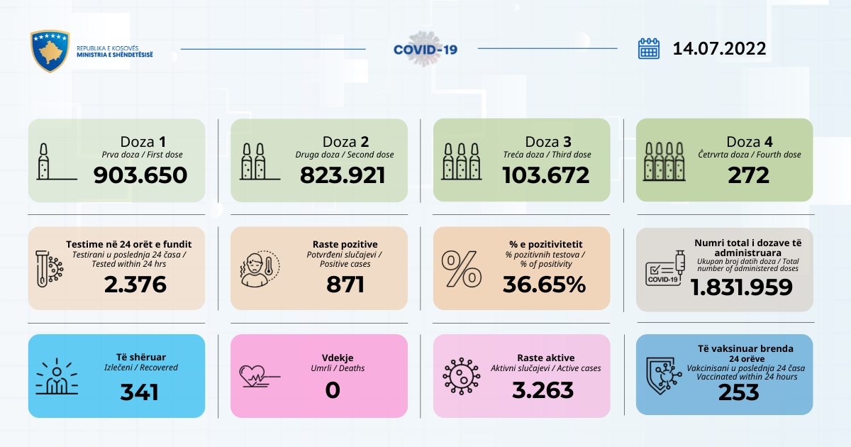 Nga 2736 testime 871 qytetarë kanë rezultuar pozitiv në 24 orët e fundit, ndërsa nuk është shënuar asnjë rast me vdekje.