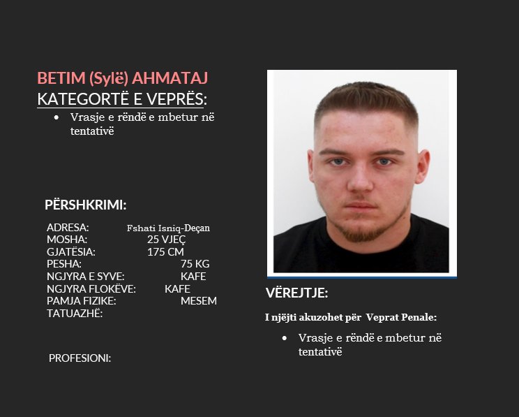 Me anë të kësaj kërkese, policia kërkon bashkëpunimin e qytetarëve për arrestimin e Betim (Sylë) Ahmetaj, 25 vjeçari i cili kërkohet për vrasje të rëndë të mbetur në tentativë.