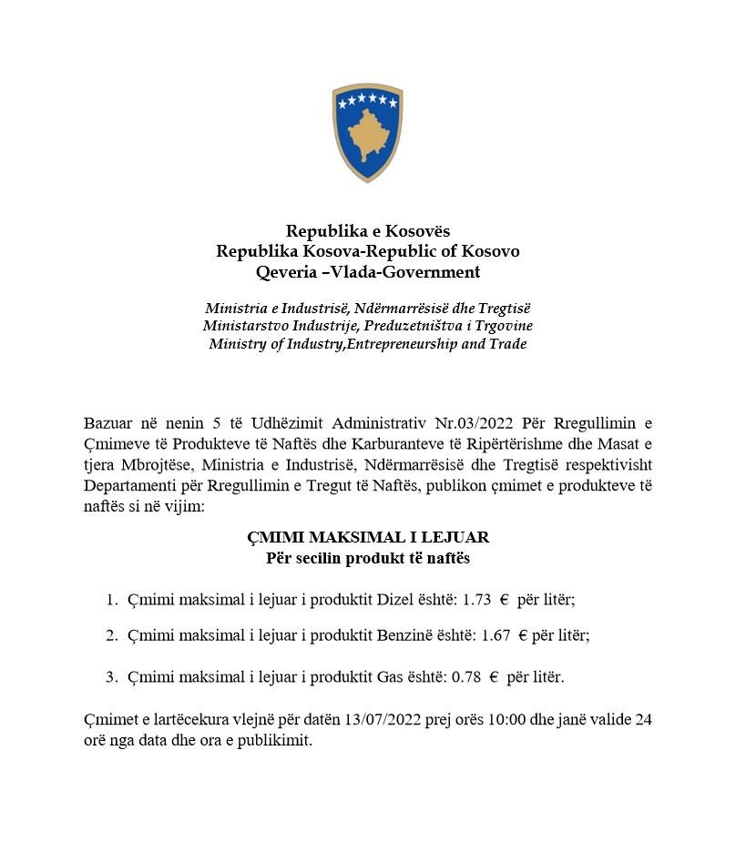 Sipas njoftimit, çmimi maksimal i lejuar i gazit ka mbetur i njëjtë, kurse nafta dhe benzina janë liruar me nga 2 cent, krahasuar një ditë më parë.