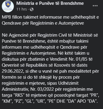 Ministria e Punëve të Brendshme ka njoftuar se qytetarët të cilët i posedojnë ende targat ilegale duhet t’i kthejnë në ato ‘RKS’ e për këtë nuk e kanë për obligim të paguajnë.