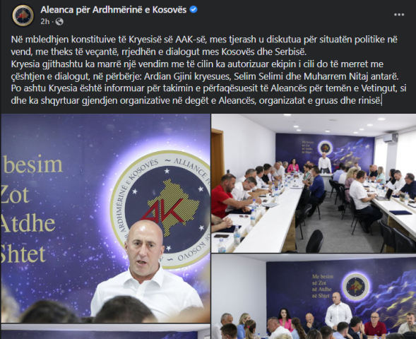 Kryesia e Aleancës për Ardhmërinë e Kosovës (AAK) ka mbajtur mbledhjen konstituive, ku mes tjerash u diskutua për situatën politike në vend, me theks të veçantë, rrjedhën e dialogut mes Kosovës dhe Serbisë.