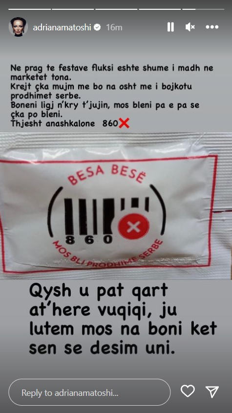 Matoshi me anë të një postimi në InstaStory në natën e ndërrimit të motmoteve, ka kërkuar nga ndjekësit e saj të anashkalojnë çdo produkt me barkodin 860, që identifikon produktet serbe.