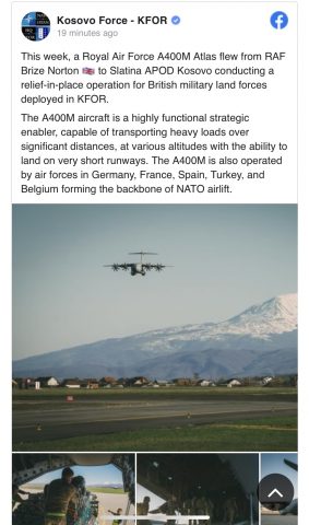 KFOR-i përmes një postimi në faqen zyrtare në ‘facebook’ kanë treguar se si këtë javë në Aeroportin e Prishtinës ka zbritur një aeroplan i Forcave Ajrore të Mbretërisë së Bashkuar i llojit “A400M Atlas”.