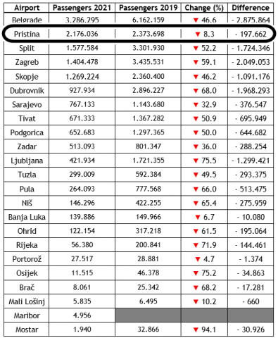 Me një total prej 3.285.295 pasagjerësh, Aeroporti i Beogradit u rendit i 71-ti përpara Edinburgut, Krakovës, Maltës, Minskut dhe Rigës, por vetëm pas Venecias dhe Sofjes. Nga ana tjetër, Ishte përpara Glasgow, Keflavik (Reykjavik) dhe Vilnius, por vetëm pas Romës Ciampino dhe Jerevanit. Këtë vit, Aeroporti i Beogradit pritet të arrijë nivelet e kapacitetit para pandemisë, ndërsa Aeroporti i Prishtinës ka shumë gjasa të regjistrojë më të ngarkuarin në histori dhe të kapërcejë rezultatet e tij para Covid.