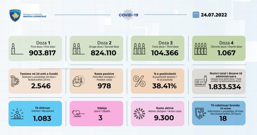Sipas të dhënave të fundit nga Ministria e Shëndetësisë, gjatë ditës së djeshme kanë vdekur tre persona , te prekur me virusin Covid. Ministria e Shëndetësisë njofton edhe për 978 raste të reja pozitive.