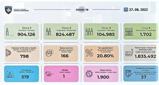 Në 24 orët e fundit është konfirmuar një vdekje dhe 166 raste të reja.