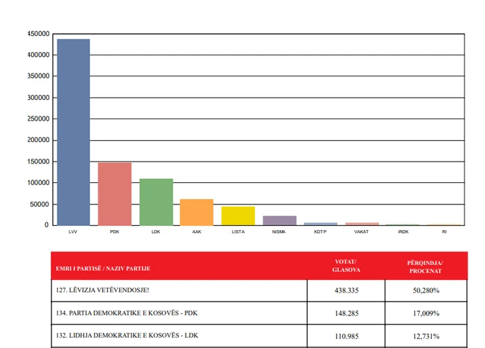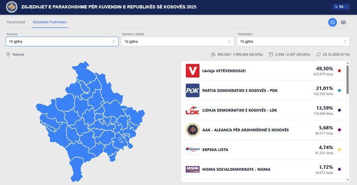 Partia e drejtuar nga Albin Kurtit, kur janë numëruar 99,26 për qind sipas Komisionit Qendror Zgjedhor, ka marrë plotë 429,979 vota, përkthyer në përqindje 49.30.