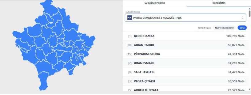 Nga PDK, i pari me më së shumti vota është Bedri Hamza, kandidat për kryeministër nga kjo parti me 109,795 vota.