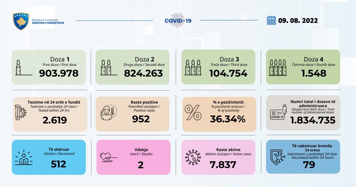 Dy persona kanë humbur betejën me COVID gjatë 24 orëve të fundit në Kosovë, ndërsa janë regjistruar edhe 952 raste të reja.