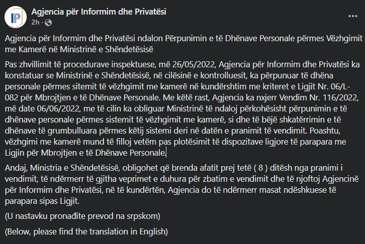 “Me këtë rast, Agjencia ka nxjerr Vendim Nr. 116/2022, më date 06/06/2022, me të cilin ka obliguar Ministrinë të ndaloj përkohësisht përpunimin e të dhënave personale përmes sistemit të vëzhgimit me kamerë, si dhe të bëjë shkatërrimin e të dhënave të grumbulluara përmes këtij sistemi deri në datën e pranimit të vendimit. Andaj, Ministria e Shëndetësisë, obligohet që brenda afatit prej tetë ditësh nga pranimi i vendimit, të ndërmerr të gjitha veprimet e duhura për zbatim e vendimit dhe të njoftoj Agjencinë për Informim dhe Privatësi, në të kundërtën, Agjencia do të ndërmerr masat ndëshkuese të parapara sipas Ligjit, ”thuhet në komunikatën për media./arbresh.info/