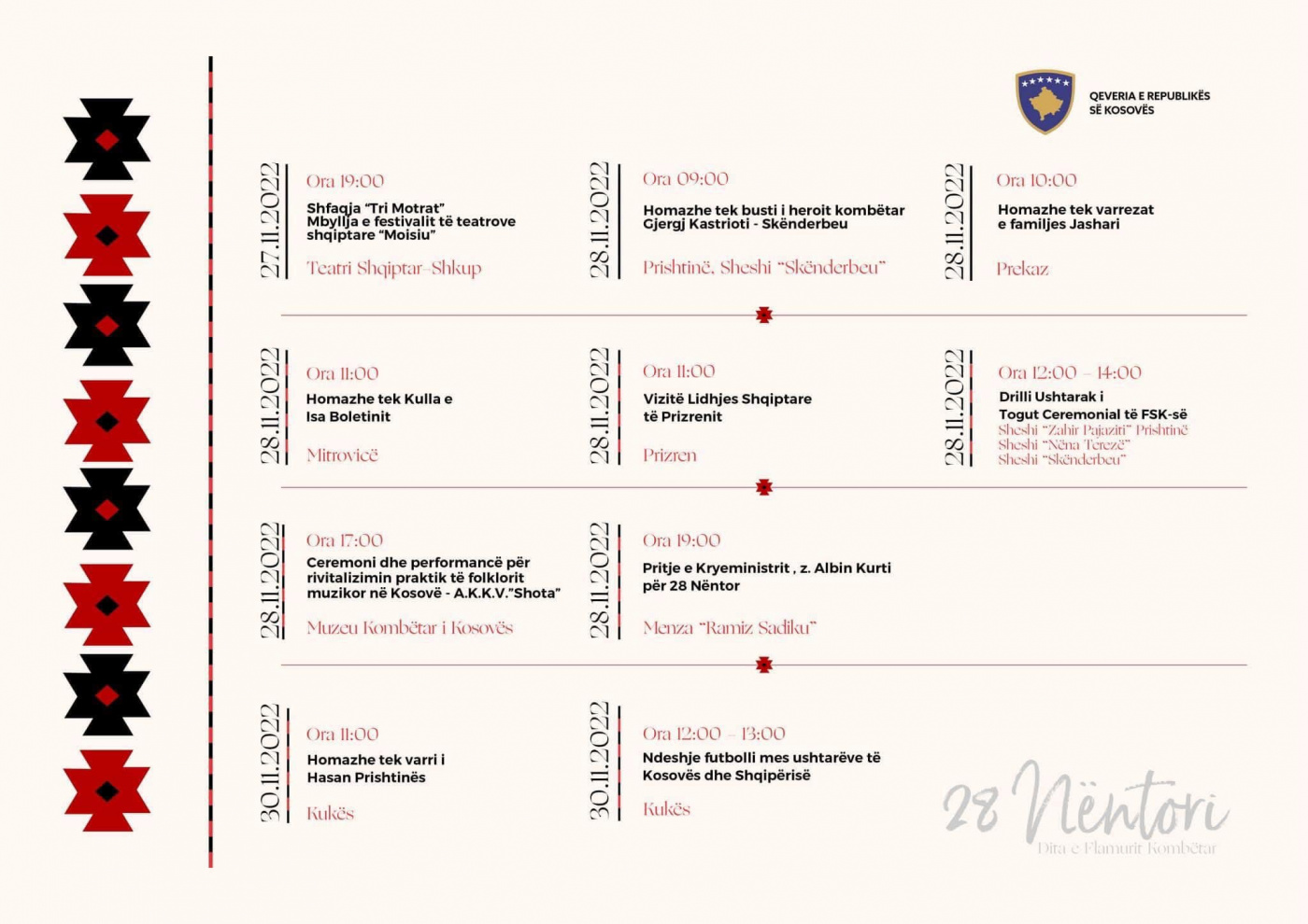 Ndërkaq, të hënën, më 28 nëntor në ora 09:00 do të ketë homazhe te busti i heroit kombëtar Gjergj Kastrioti- Skenderbeu, ndërkaq në ora 10:00 homazhe tek varrezat e familjes Jashari në Prekaz.
