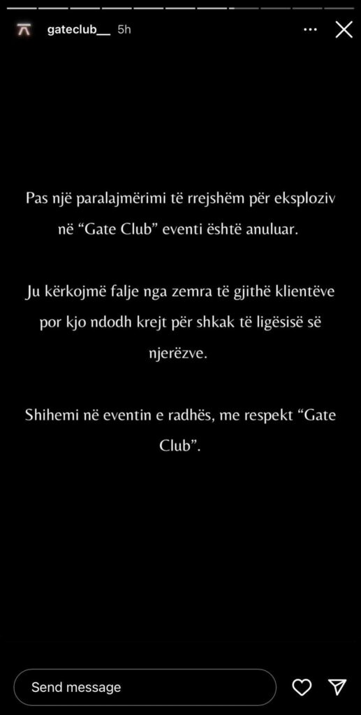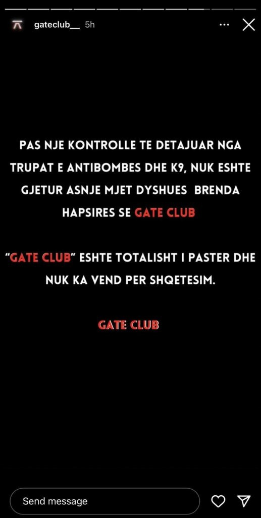 “Pas një kontrolli të detajuar nga trupat e antibombës dhe njësiti K9, nuk është gjetur asnjë mjet dyshues brenda hapësirës së Gate Club”, thuhet në sqarimin e diskotekës.