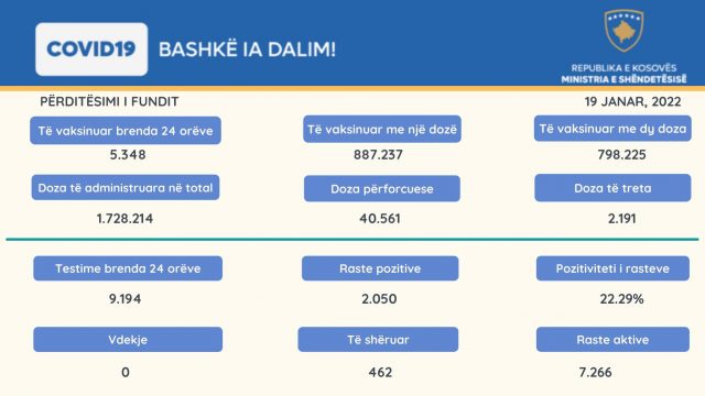 19 Janar 2022: Ministria e Shëndetësisë, sipas të dhënave nga Instituti Kombëtar i Shëndetësisë Publike të Kosovës, informon: