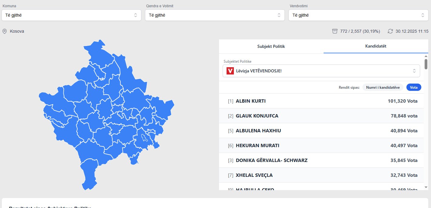 Sipas rezultateve preliminare, Kurti vazhdon të kryesojë bindshëm garën, ndërsa procesi i numërimit të votave është ende në zhvillim.
