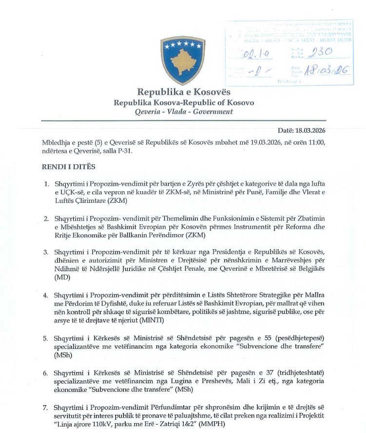 Ndër të tjera në rend dite në mbledhjen e sotme të Qeverisë është shqyrtimi i Propozim-vendimit për bartjen e Zyrës për çështjet e kategorive të dala nga lufta e UÇK-së, e cila vepron në kuadër të ZKM-së, në Ministrinë për Punë, Familje dhe Vlerat e Luftës Çlirimtare, shqyrtimi i Propozim-vendimit për Themelimin dhe Funksionimin e Sistemit për Zbatimin e Mbështetjes së Bashkimit Evropian për Kosovën përmes Instrumentit për Reforma dhe Rritje Ekonomike për Ballkanin Perëndimor.