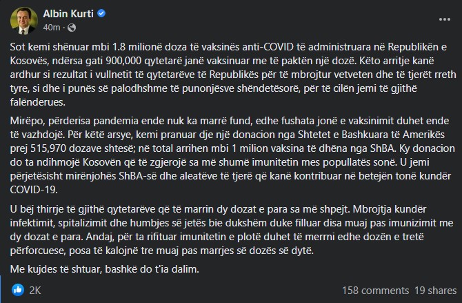 Përmes një postimi në Facebook, Kurti ka thënë se sot kemi shënuar mbi 1.8 milionë doza të vaksinës anti-COVID të administruara në Republikën e Kosovës, ndërsa gati 900 mijë qytetarë janë vaksinuar me të paktën një dozë.