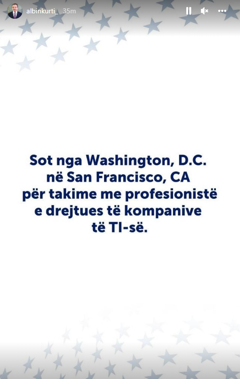 “Sot nga Uashington, D.C., në San Francisco, Kaliforni për takime me profestionstë e drejtues të kompanive të IT-së.”, njoftoi kryeministri përmes një story në Instagram. /arbresh.info/