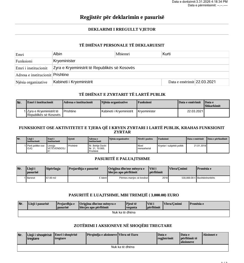 Kryeministri i Kosovës, Albin Kurti, ka deklaruar pasurinë e tij vjetore pranë Agjencisë për Parandalimin e Korrupsionit.