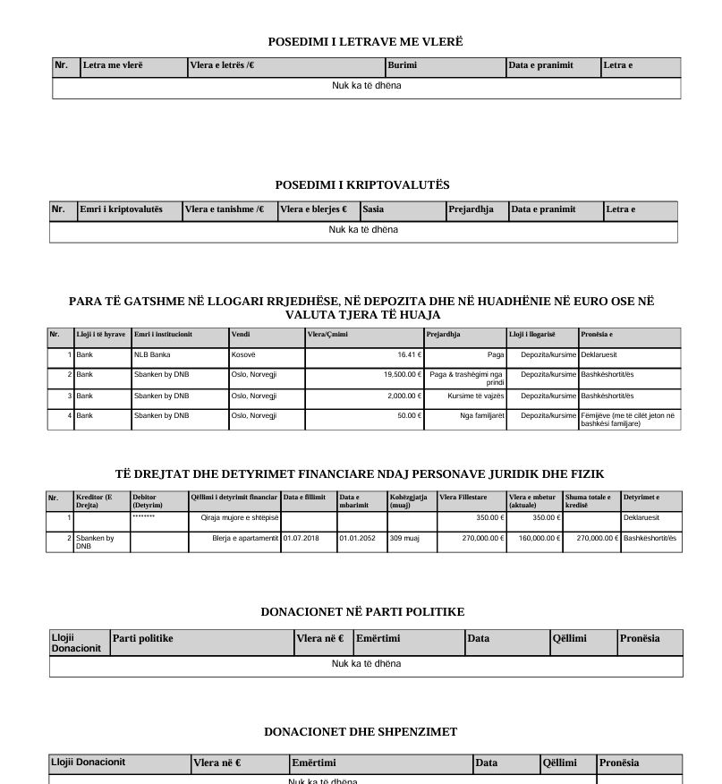Sipas raportit, nuk ka ndryshime në pasuritë e paluajtshme. Para të gatshme në emër të tij ka deklaruar 16.41 centë, ndërsa figuron edhe banesa e bashkëshortes me vlerë 530 mijë euro.