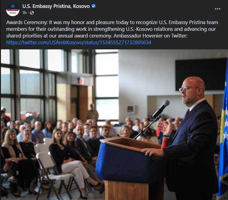 “Ishte nderi dhe kënaqësia ime sot të njoh anëtarët e ekipit të Ambasadës së Shteteve të Bashkuara në Prishtinë për punën e tyre të jashtëzakonshme në forcimin e marrëdhënieve SHBA-Kosovë dhe avancimin e prioriteteve tona të përbashkëta në ceremoninë tonë vjetore të çmimeve”, tha ambasadori Hovenier.