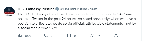 “Llogaria zyrtare e Ambasadës së SHBA në Twitter nuk ka “pëlqyer” qëllimisht asnjë postim në Tëitter gjatë 24 orëve të fundit. Siç u përmend më herët: kur kemi një pozicion për të artikuluar, ne e bëjmë këtë nëpërmjet deklaratave zyrtare, që i atribuohen – jo nga një “like” e mediave sociale” thuhet tutje në reagim./arbresh.info/