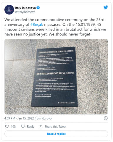 Ambasada e Italisë në Kosovë ka kujtuar masakrën e Reçakut në 23 vjetorin e saj.