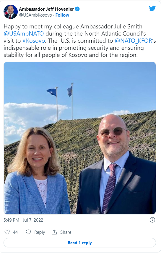 “ I lumtur që takova kolegen time, ambasadoren Julie Smith gjatë vizitës së Këshillit të Atlantikut të Veriut në Kosovë. SHBA-të janë të përkushtuara ndaj rolit të domosdoshëm të NATO-KFOR-it në promovimin e sigurisë dhe garantimit të stabilitetit për të gjithë njerëzit e Kosovës dhe për rajonin”, ka thënë Hovenier.