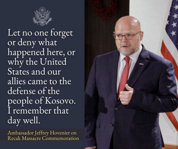 Ambasadori i SHBA-së në Kosovë, Jeffrey Hovenier, në 24-vjetorin e Masakrës së Reçakut, ka përsëritur fjalimin e vitit të kaluar që e ka mbajtur në ceremoninë përkujtimore.
