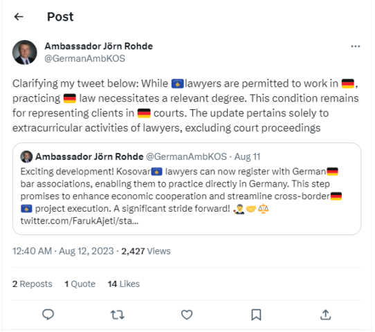 “Sqarim i postimit tim të mëposhtëm: Derisa avokatëve kosovarë u lejohet të punojnë në Gjermani, praktikimi i ligjit gjerman kërkon një diplomë përkatëse. Ky kusht mbetet për përfaqësimin e klientëve në gjykatat gjermane. Përditësimi ka të bëjë vetëm me aktivitetet jashtë programit të avokatëve, duke përjashtuar procedurat gjyqësore”, ka shkruar Rhode në Twitter.