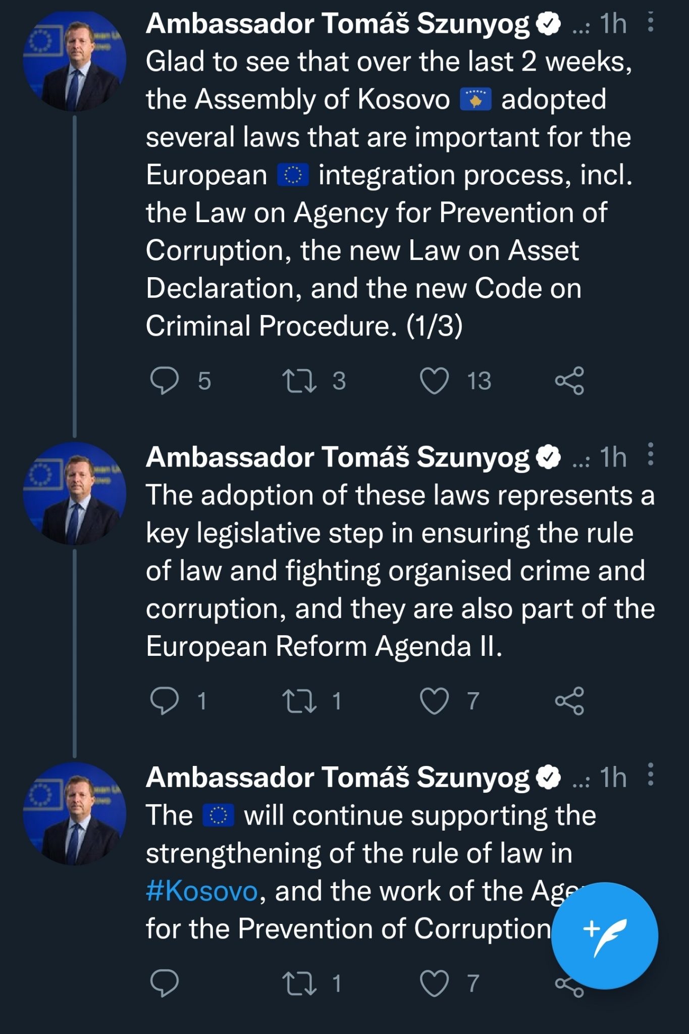 “Më vjen mirë që gjatë 2 javëve të fundit Kuvendi i Kosovës ka miratuar disa ligje që janë të rëndësishme për procesin e integrimit evropian, përfshirë këtu Ligjin për Agjencinë për Parandalimin e Korrupsionit, Ligjin e ri për Deklarimin e Pasurisë dhe Kodin e ri për Procedurën Penale. Miratimi i këtyre ligjeve paraqet një hap kyç legjislativ në garantimin e sundimit të ligjit dhe luftimin e krimit të organizuar dhe korrupsionit, dhe ato janë gjithashtu pjesë e Agjendës së Reformës Evropiane II”, ka shkruar ai.