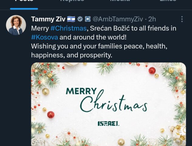 Tamar Ziv, Ambasadore e Shtetit të Izraelit në Republikën e Kosovës, në platformën “X” ua ka uruar festën e Krishtlindjes të gjithë atyre që festojnë sipas kalendarit Julian.