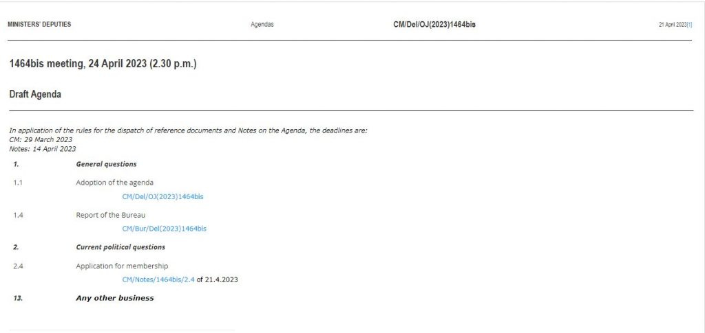 Sipas publikimit të agjendës së Komitetit të Ministrave, bëhet e ditur se pika 2.4 do të jetë për aplikimet për anëtarësim.