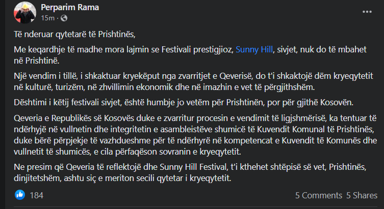 “Me keqardhje të madhe mora lajmin se Festivali prestigjioz, Sunny Hill, sivjet, nuk do të mbahet në Prishtinë. Një vendim i tillë, i shkaktuar kryekëput nga zvarritjet e Qeverisë, do t’i shkaktojë dëm kryeqytetit në kulturë, turizëm, në zhvillimin ekonomik dhe në imazhin e vet të përgjithshëm. Dështimi i këtij festivali sivjet, është humbje jo vetëm për Prishtinën, por për gjithë Kosovën”, shkruan Rama.