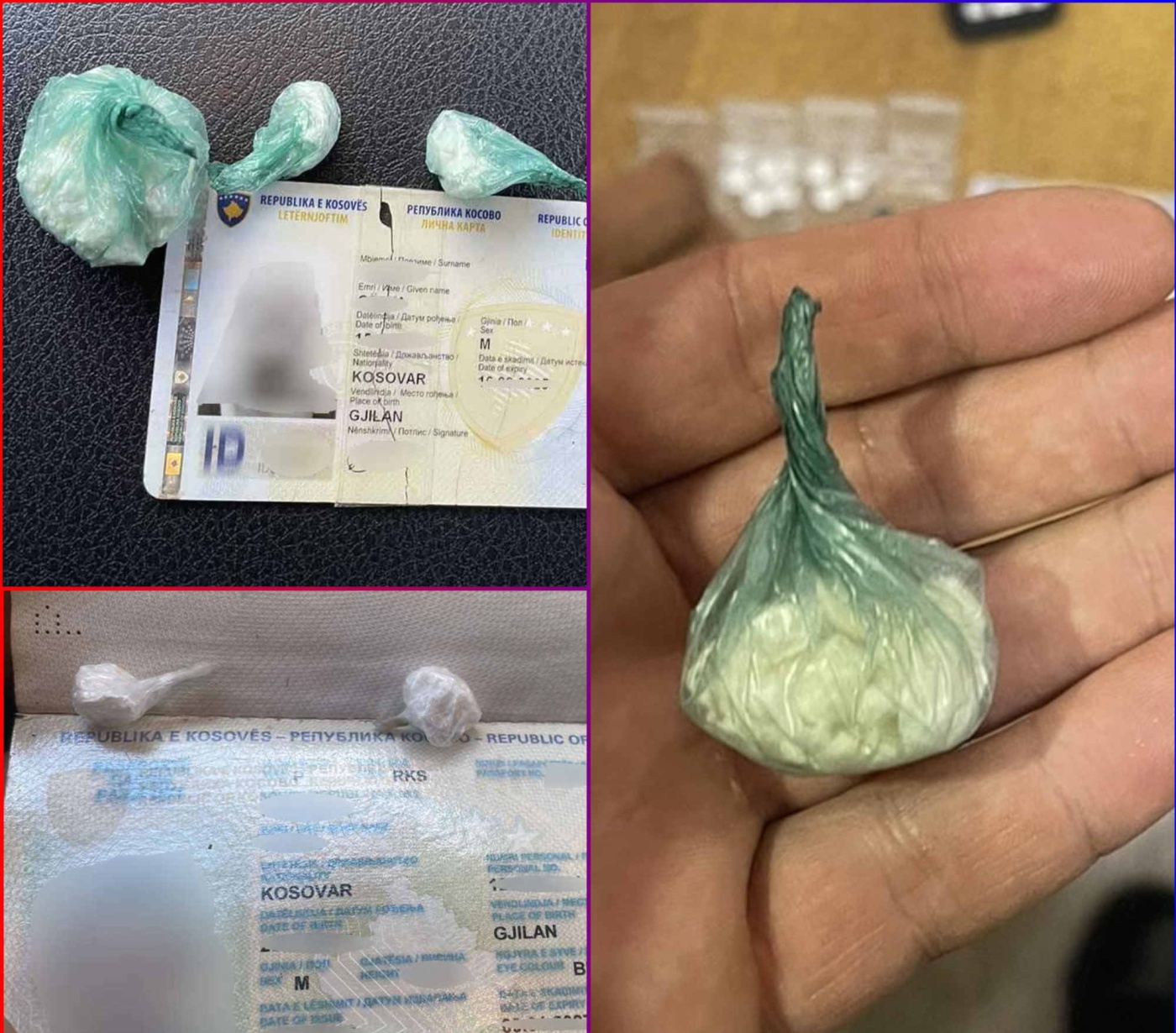 Gjatë kontrollit nga ana e Policisë së Kosovës tek njëri nga të dyshuarit janë gjetur tri (3) qese najloni që dyshohet të jenë substancë narkotike e llojit kokainë dhe nëntë tableta mjekësore, ndërsa tek i dyshuari tjetër janë gjetur gjithashtu dy qese me substancë narkotik e llojit kokainë.